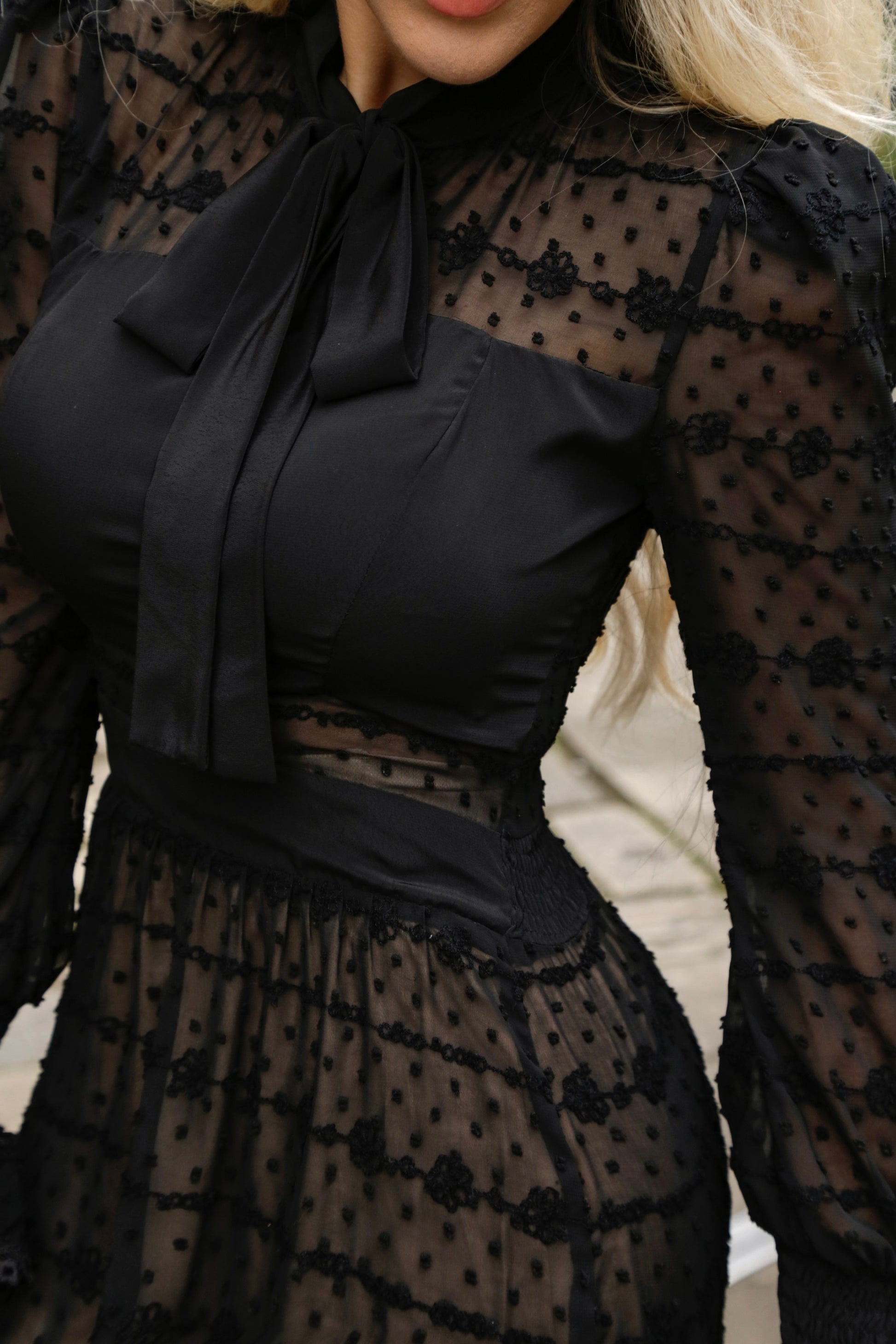 Dress made in embroidered Chiffon and details in Moroccan crepe. Nude lining to highlight the fabric design, bow on the bust and decorative buttons. Fashion-forward cut and detailing, featuring an elegant combination of fabrics for a timeless look.