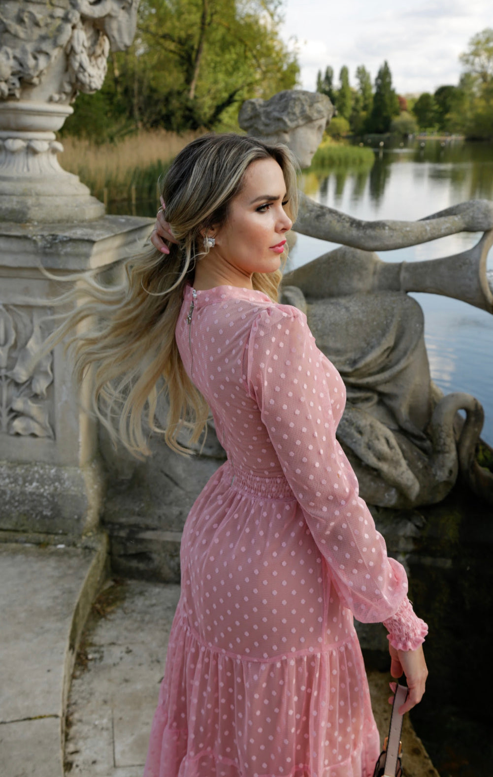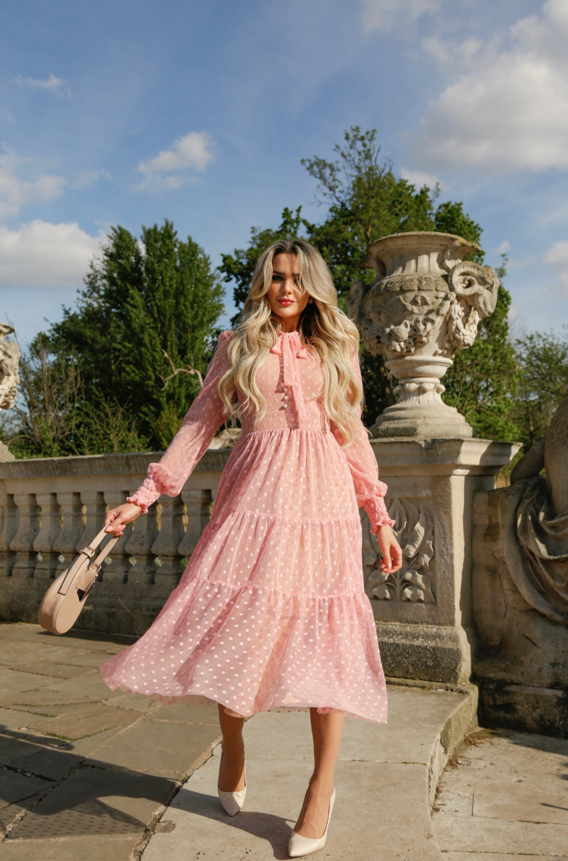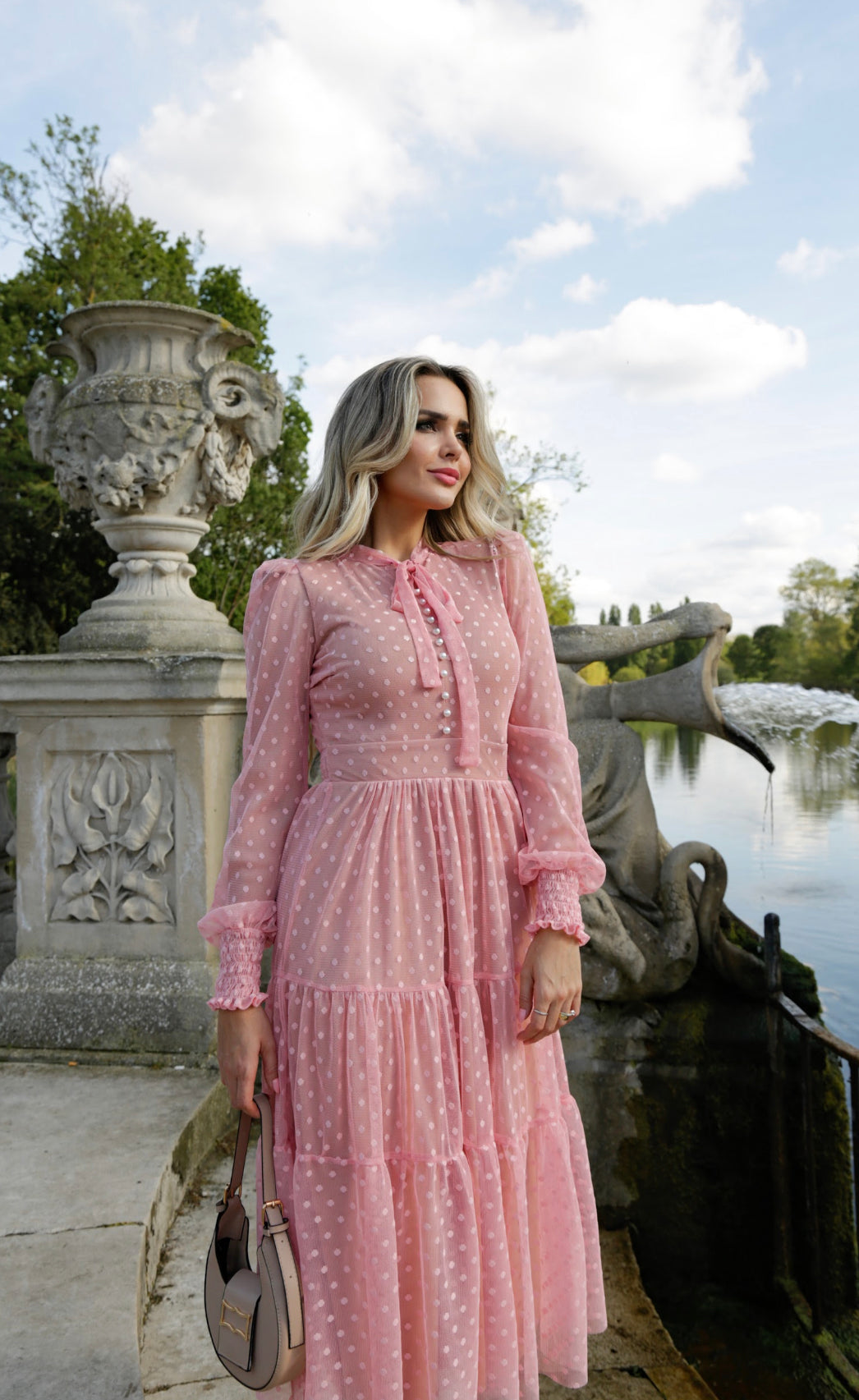 Introducing the stunning Katarina Dress, a vision in light pink crafted from lightweight mesh material. This elegant long sleeve midi dress envelops you in grace and beauty. The high neckline is adorned with a charming bow, adding a touch of sophistication to the ensemble. A row of delicate pearls graces the front, accentuating the dress's exquisite detailing and lending an air of refinement. The A-line silhouette gracefully cascades down, flattering your figure and creating a look of timeless elegance. With its combination of ethereal charm and impeccable craftsmanship, the Katarina Dress is the perfect choice for special occasions or moments when you want to radiate grace and poise.