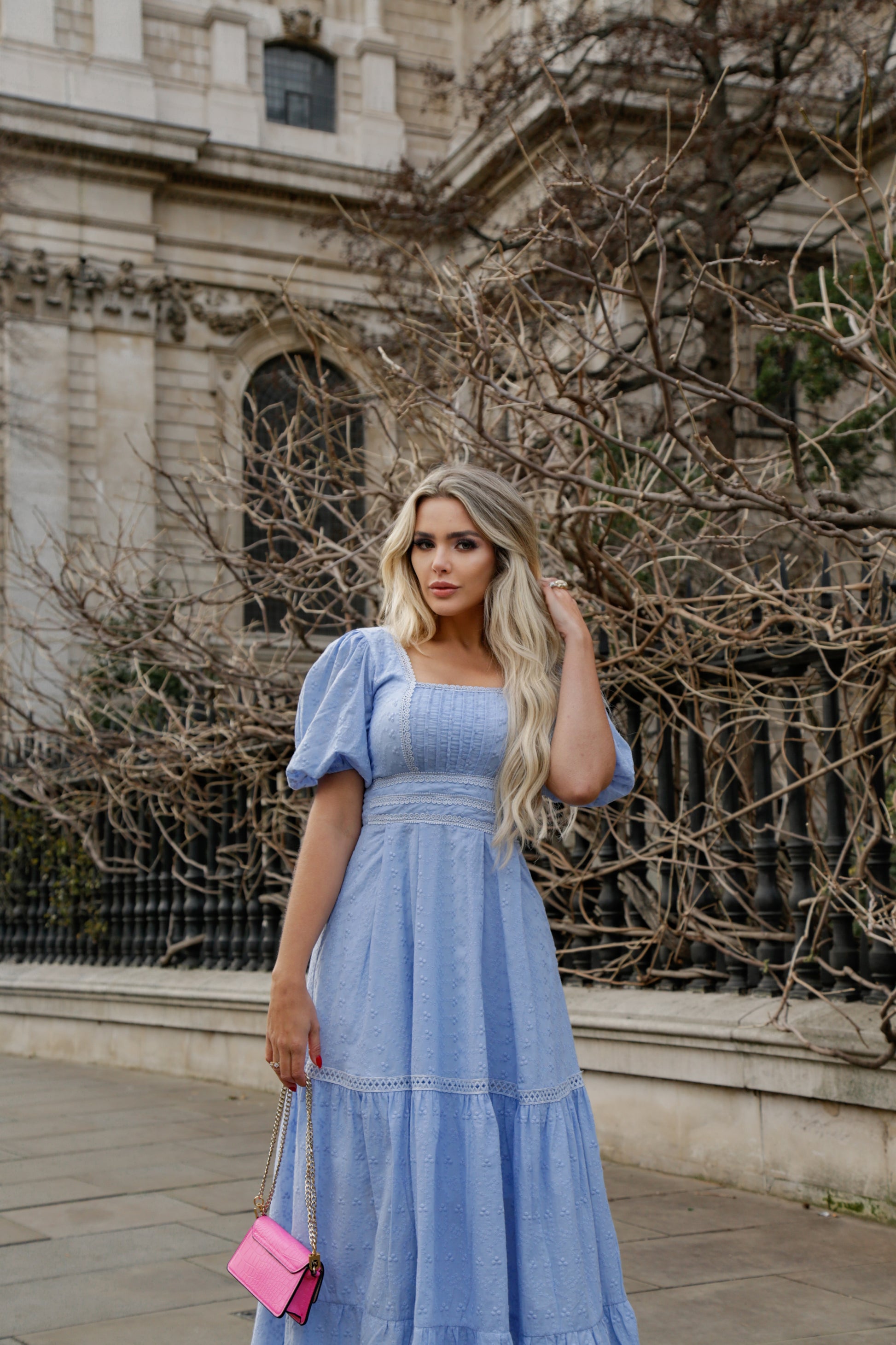 Dress in cotton laise in midi length, skirt with pleats and lining. It has puffed sleeves, zipper and hand-dyed trims, tying details on the back. The perfect marriage of effortless sophistication and comfortable wearability. Perfect for any occasion.